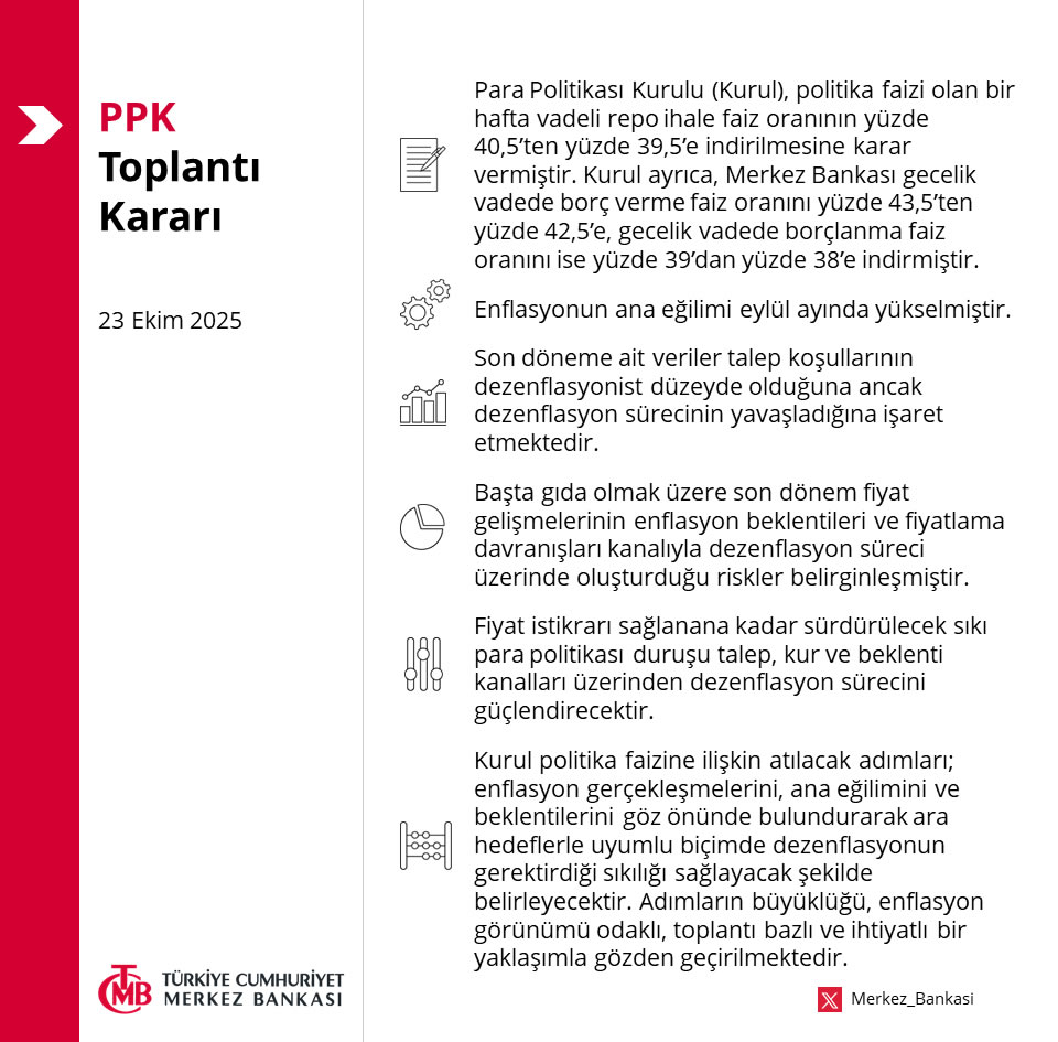 Türkiye Cumhuriyet Merkez Bankası bugün saat 14:00’da ekim ayı faiz kararını açıkladı. Para Politikası Kurulu (Kurul), politika faizi olan bir hafta vadeli repo ihale faiz oranının yüzde 40,5’ten yüzde 39,5’e indirilmesine karar verdi.